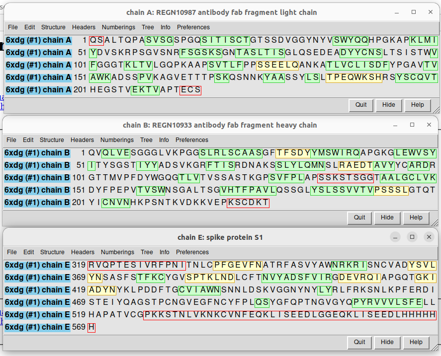| Sequences of the different chains in the 6XDG PDB code, corresponding to a fragment of the spike protein (chain E) and the light (chain A and chain D -equal sequence, not shown) and heavy (chain B and chain C -equal sequence, not shown) chains of the REGN10933 neutralizing antibody. |