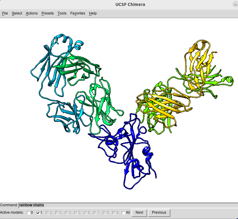 Chimera snapshot of the structure of 6XDG. The figure has been obtained by, first selecting Presets / Publication 1 and then activating Favorites / Command Line and typing the rainbow chain parameter in the command line box |