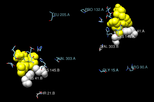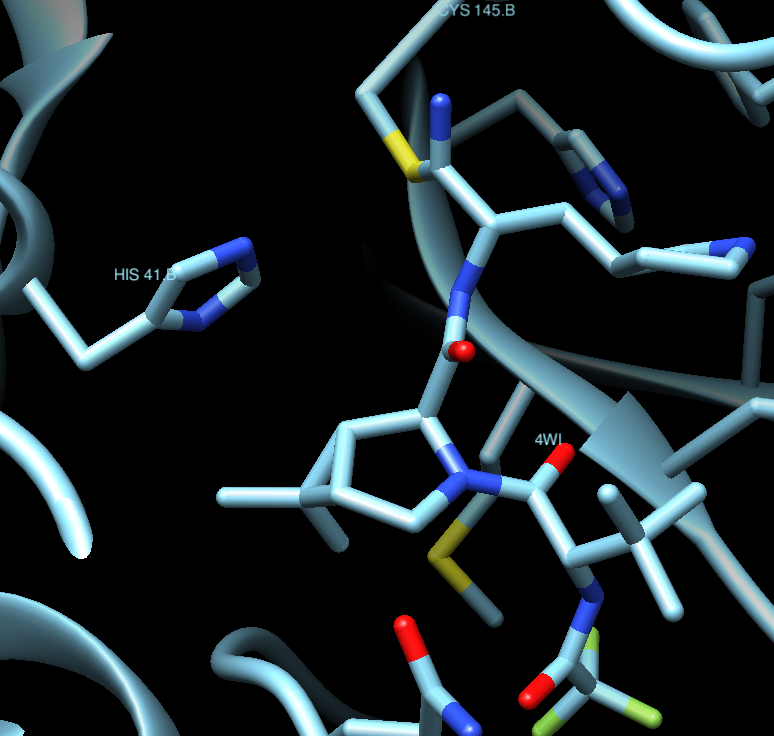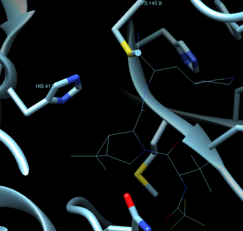 Where we can appreciate that the ligand is covalently bound to Cys145, which makes it more potent and irreversible. The ligand is, thus, a real obstacle for the protein to properly function.