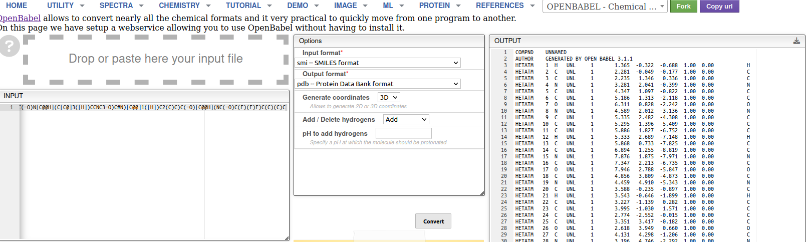| Detail on the use of OpenBabel to fix Nirmatrelvir structure. Left: we input the SMILES of the molecule. Middle: setting up the parameters for the generation of the PDB format from SMILES. Right: final PDB file (right hand side of previous panel of images). |