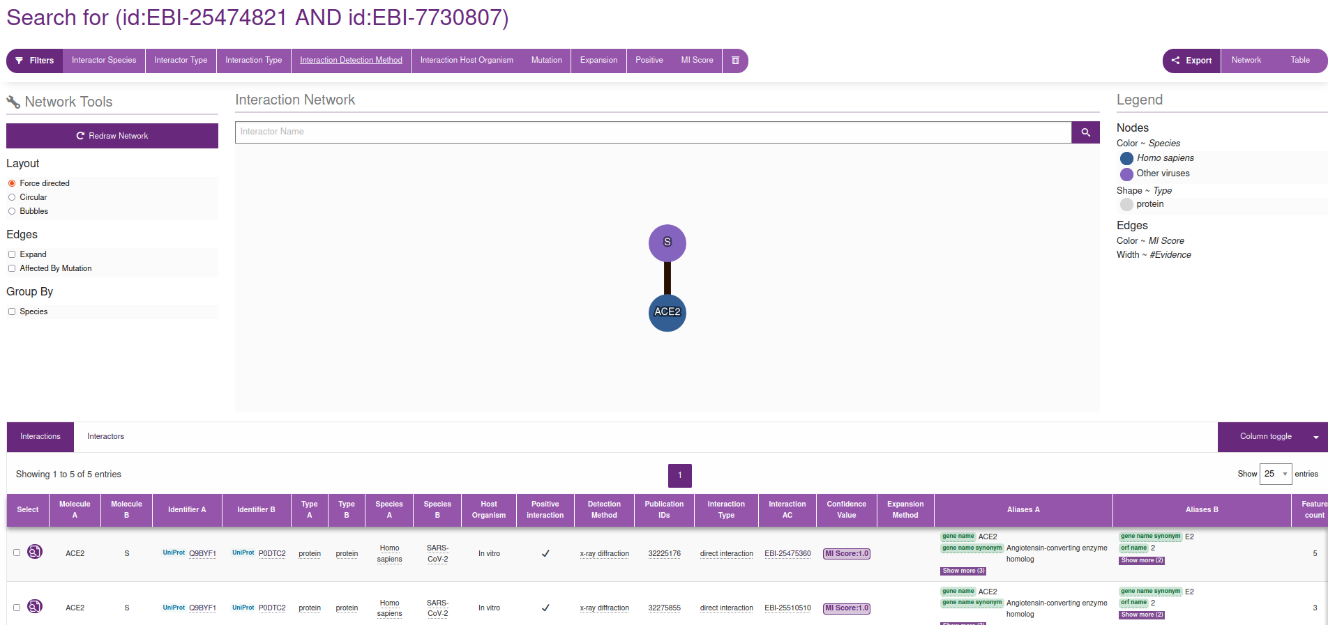 Again, many routes lead to the same place. For example, in the interactions section we have identified an interaction with 254 experiments (see image above). If we click in the link in the right of the row pointing to the INTACT database, we reach this page, where we can filtrate by Interaction Method / x-ray diffraction: